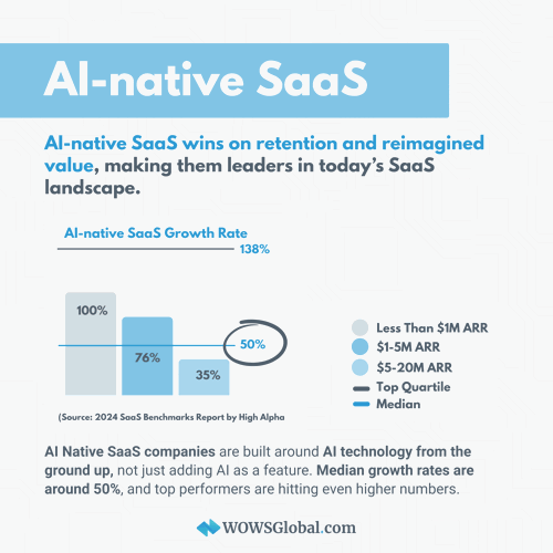 According to the 2024 SaaS Benchmarks Report by High Alpha, vertical and AI‑native SaaS models are currently delivering higher median growth and stronger top‑quartile outcomes than horizontal peers. Teams evaluating product strategy, or where to place their next bet, should weigh specialization and AI‑native advantages alongside market size and go‑to‑market fit.