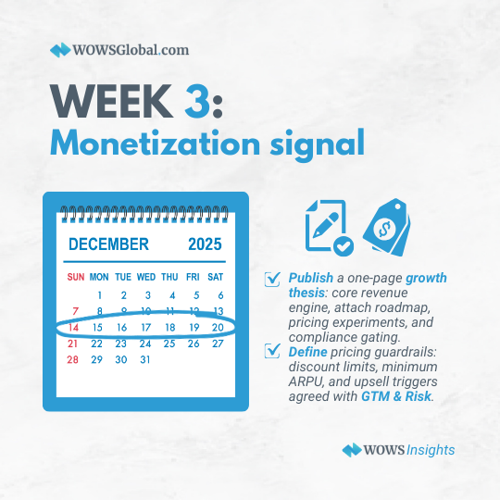 Week 1: close books cleanly, lock KPI definitions, map runway. Week 2: rebuild the 24‑month model with risk and regulatory capital; schedule Audit & Risk. Week 3: sharpen one primary revenue engine and pricing; document compliance runbooks. Week 4: assemble the data room and lender data tape. WOWS Global can facilitate each step end‑to‑end.