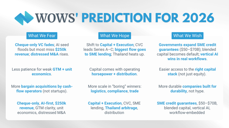 Below are WOWS’ 2026 Predictions: ten calls on how the region’s capital stack, startup playbooks, and investor priorities could change by the end of 2026. Treat this as a forward-looking map, not a statement of fact.